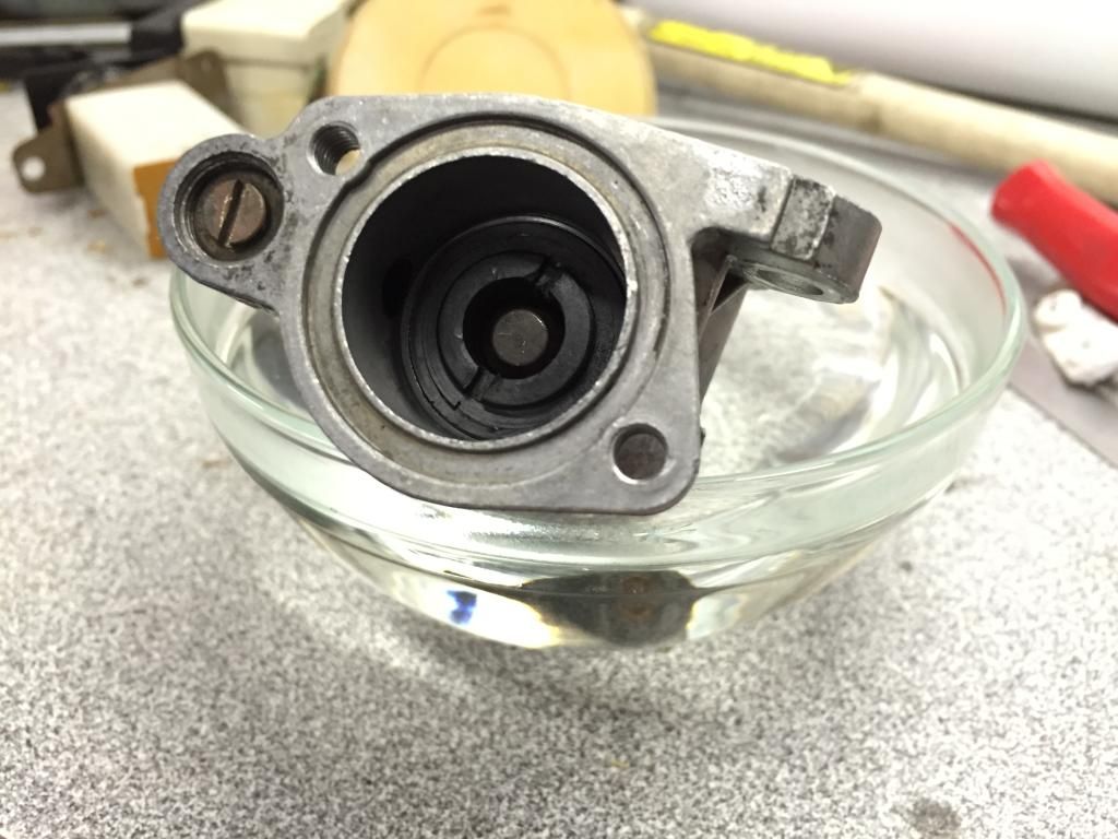 This is from our test of the auto choke after giving it a good clean up. It's really hard to tell in this photo, but that little domed bit in the middle is the bit that moves up when the coolant is hot and seals against the inside of the black donut shaped piece. It's closed in this pic.